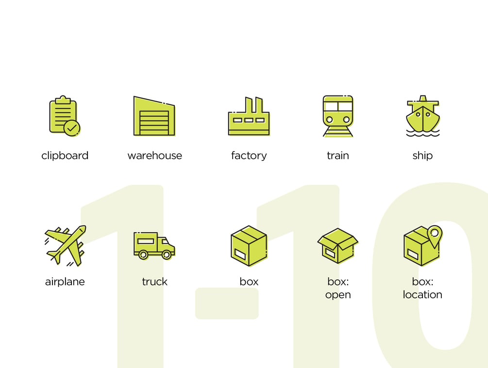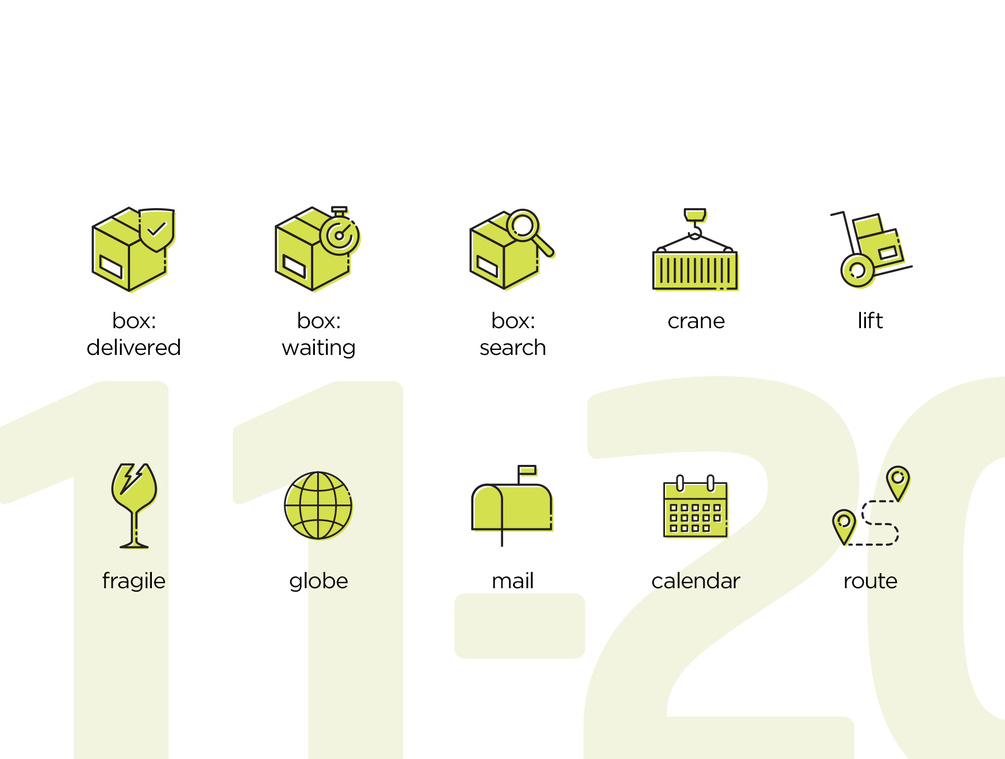 Set of 20 logistics animated SVG icons. Created in Illustrator, animated in After Effects, using Bodymovin Lottie. The set features two icon options: