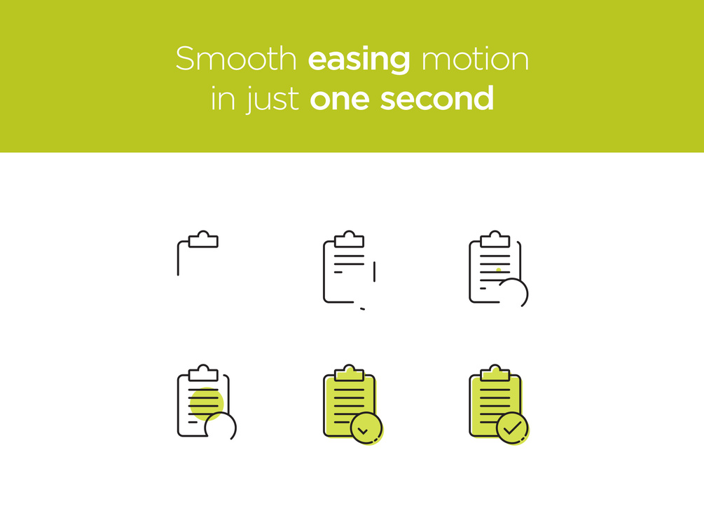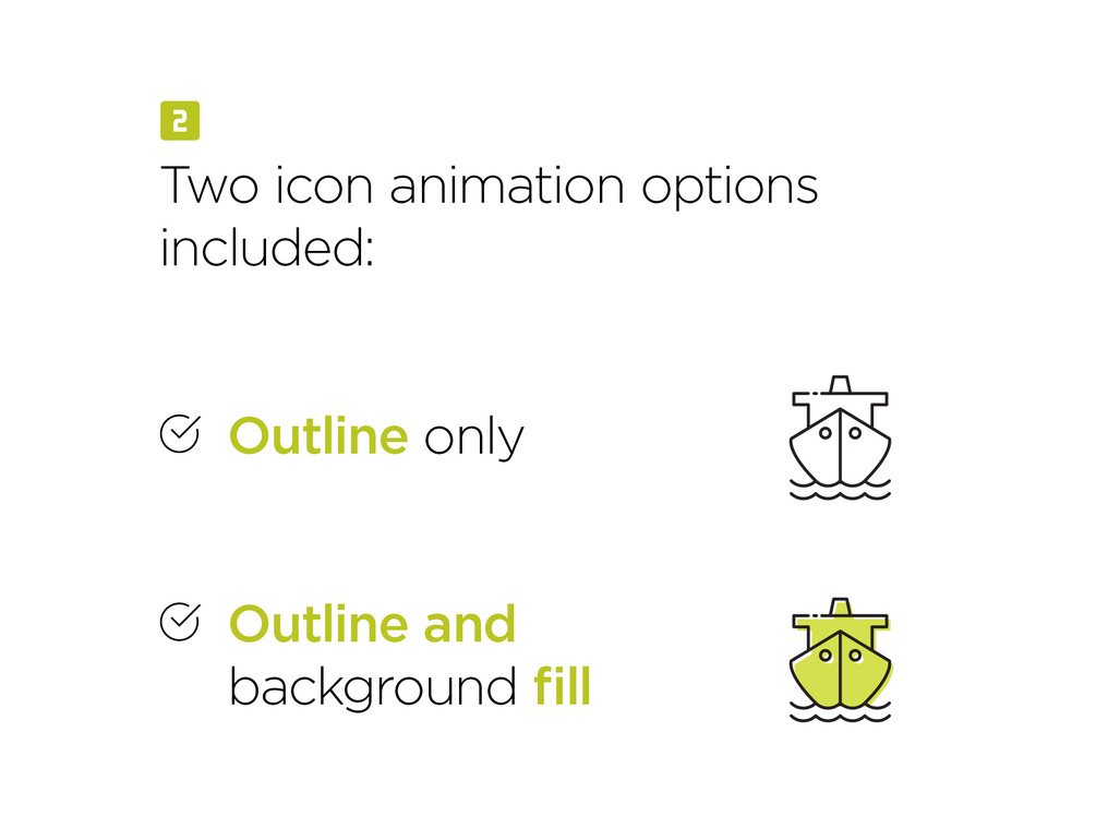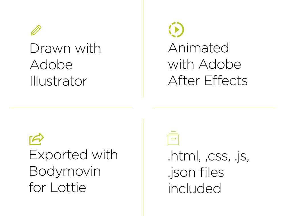 Static SVG files are provided for usage in Illustrator, Photoshop, After Effects, etc. Each icon animated option in delivered in the following file types: