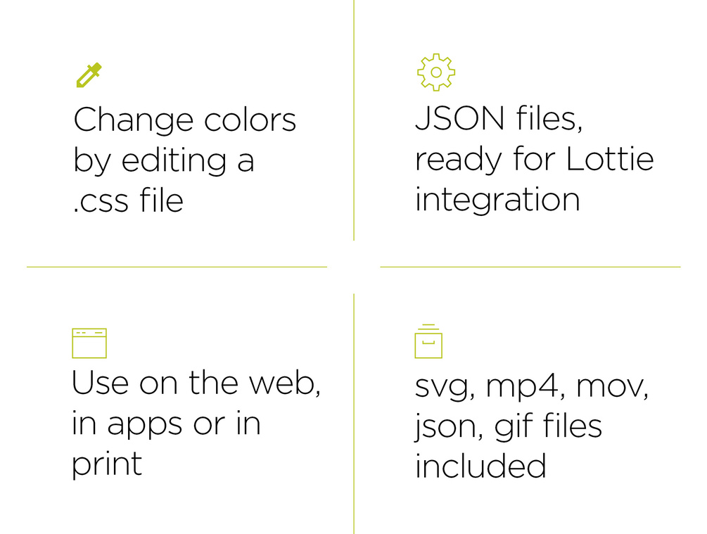 Static SVG files are provided for usage in Illustrator, Photoshop, After Effects, etc. Each icon animated option in delivered in the following file types: