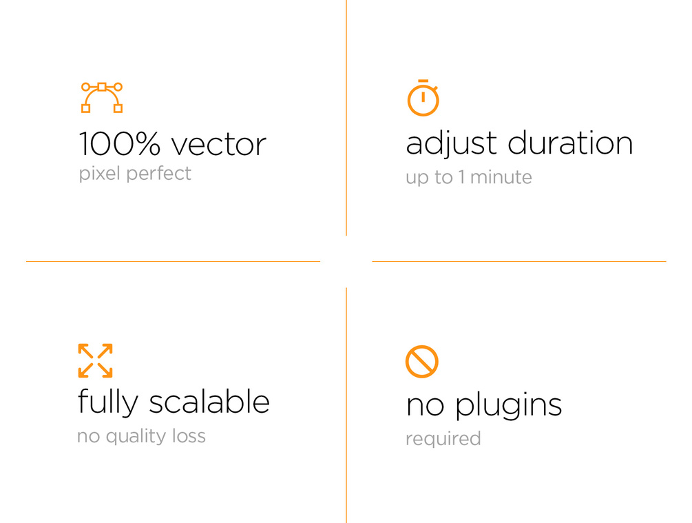 The built-in controls allow you to easily customize the background color or to export on solid or transparent background. Adjust animation duration and scale with just few clicks. In addition, you can recolor each icon individually or set a global color for all of them. Video tutorial is included in the package. No plugins required. Just open, customize and render away!